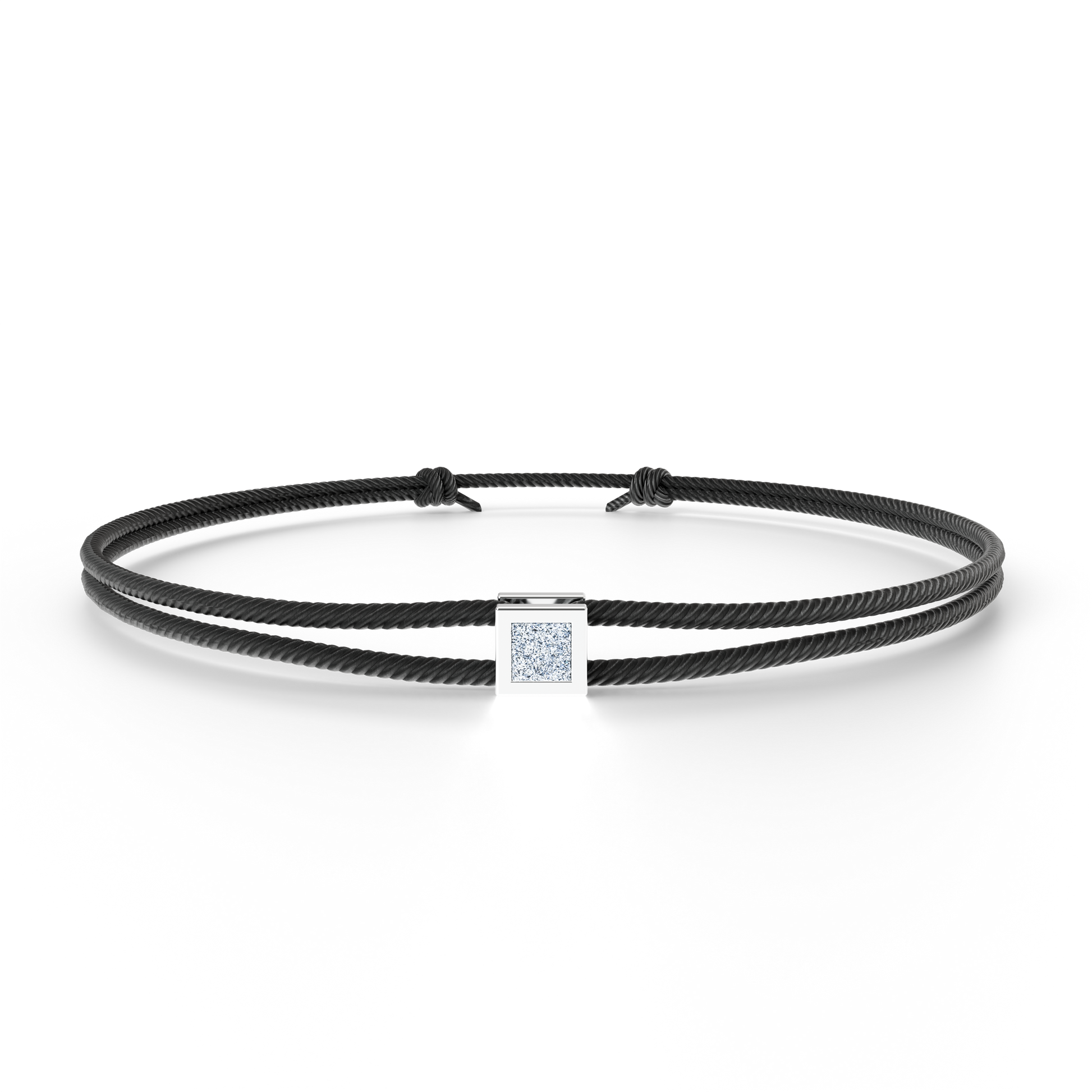 Un bracelet sur cordon élégant orné en son centre d'un carré d'osmium cristallin. Ce cube représente la stabilité, l'équilibre et la résilience, symbole de solidité et de force intérieure.